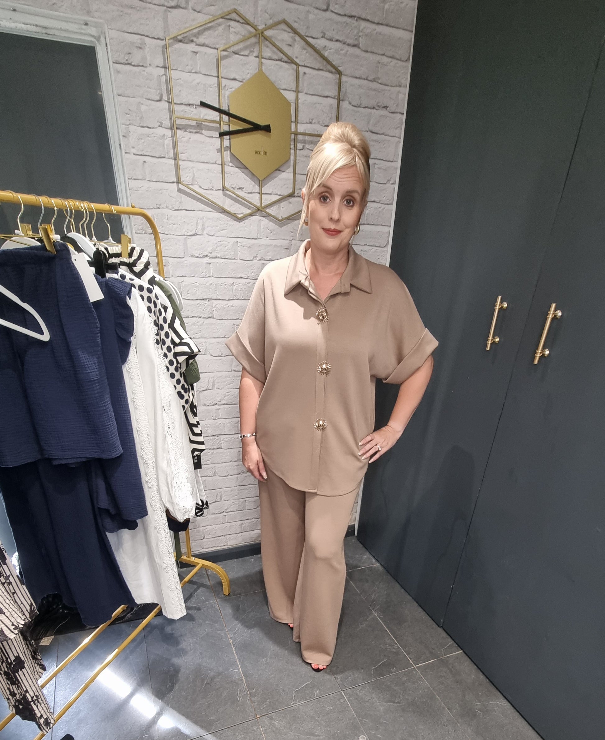 Meet The Sienna Set— Drenched in a soft mocha hue and adorned with radiant gold sunburst buttons, this co-ord set is your invitation to dress with intention, ease, and confidence.